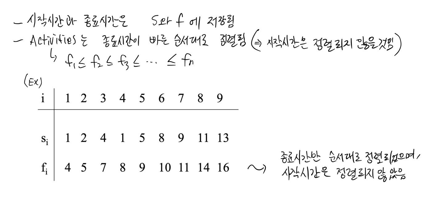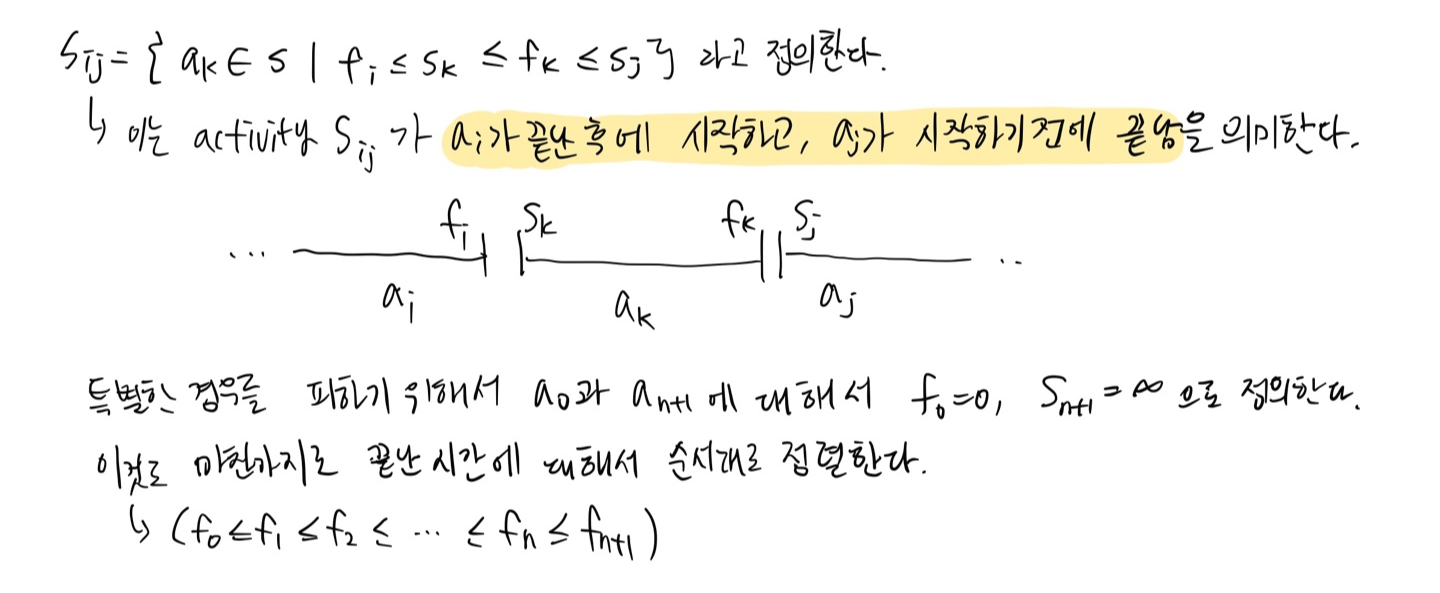Goal: nonoverlapping activities 의 largest possible set을 선택함