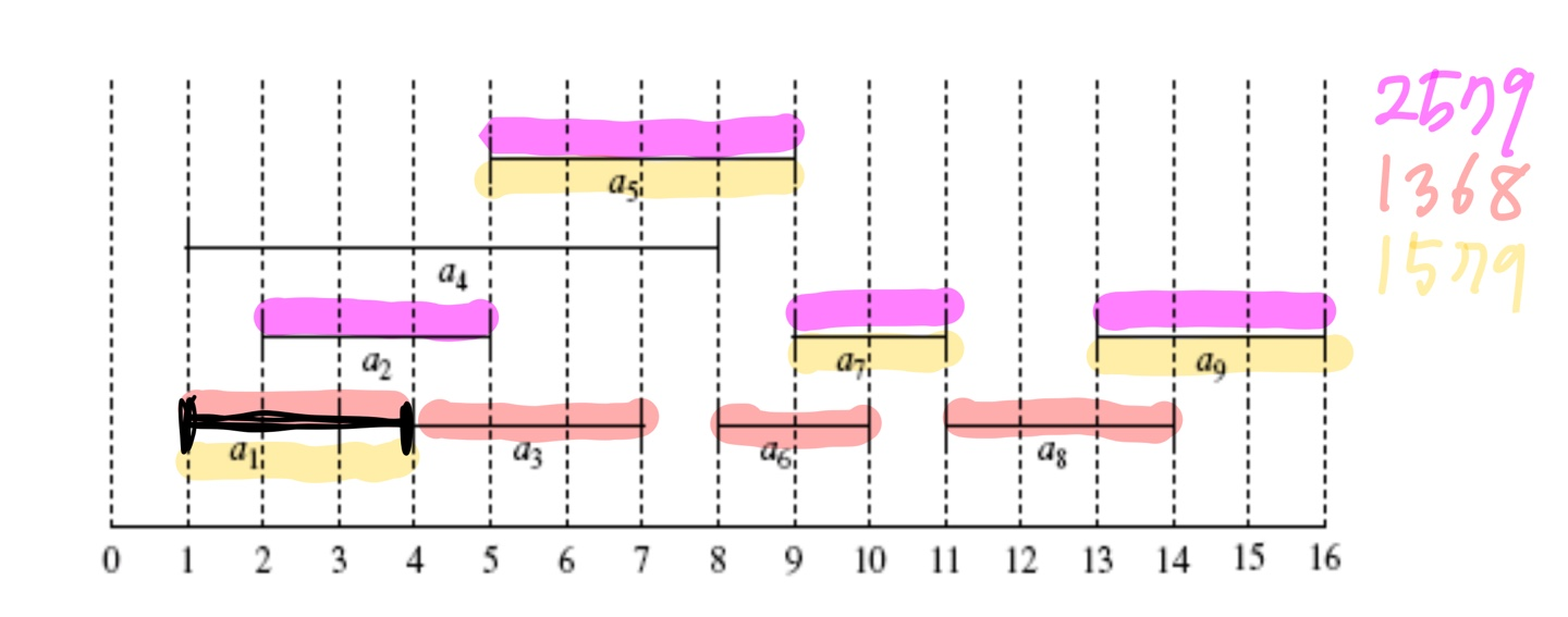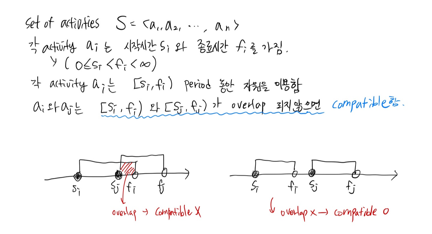 Problem: 여러 competing activities 사이의 스케줄을 조정하는 것 ( 각 activity에 대해서 시작과 종료시간은 주어짐)