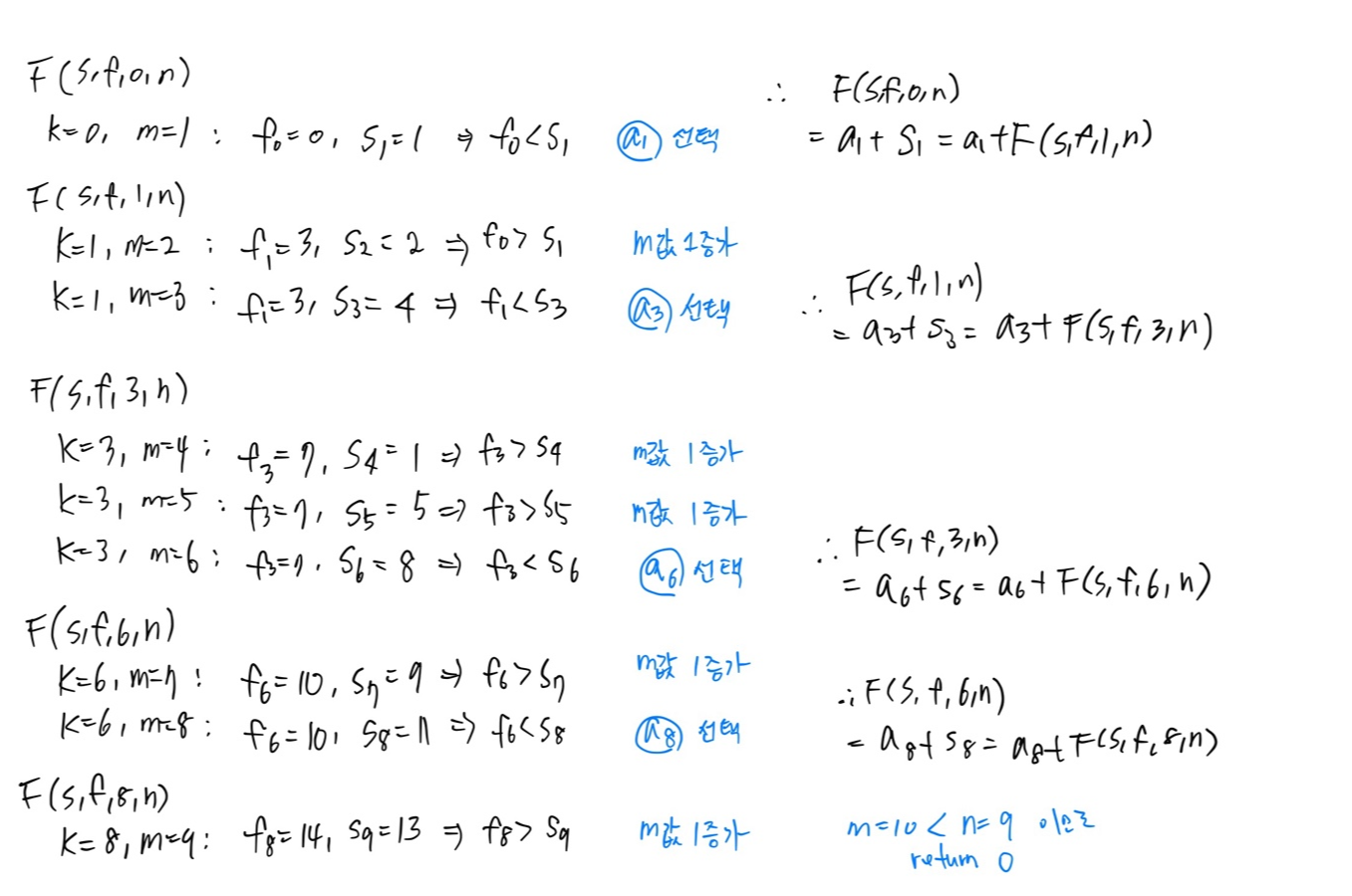 ak와 오버랩되지 않는 am을 찾을 때까지 ak+1, ak+2, ..., an 을 차례대로 체크한다.