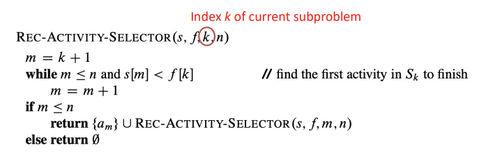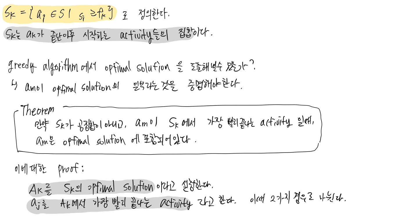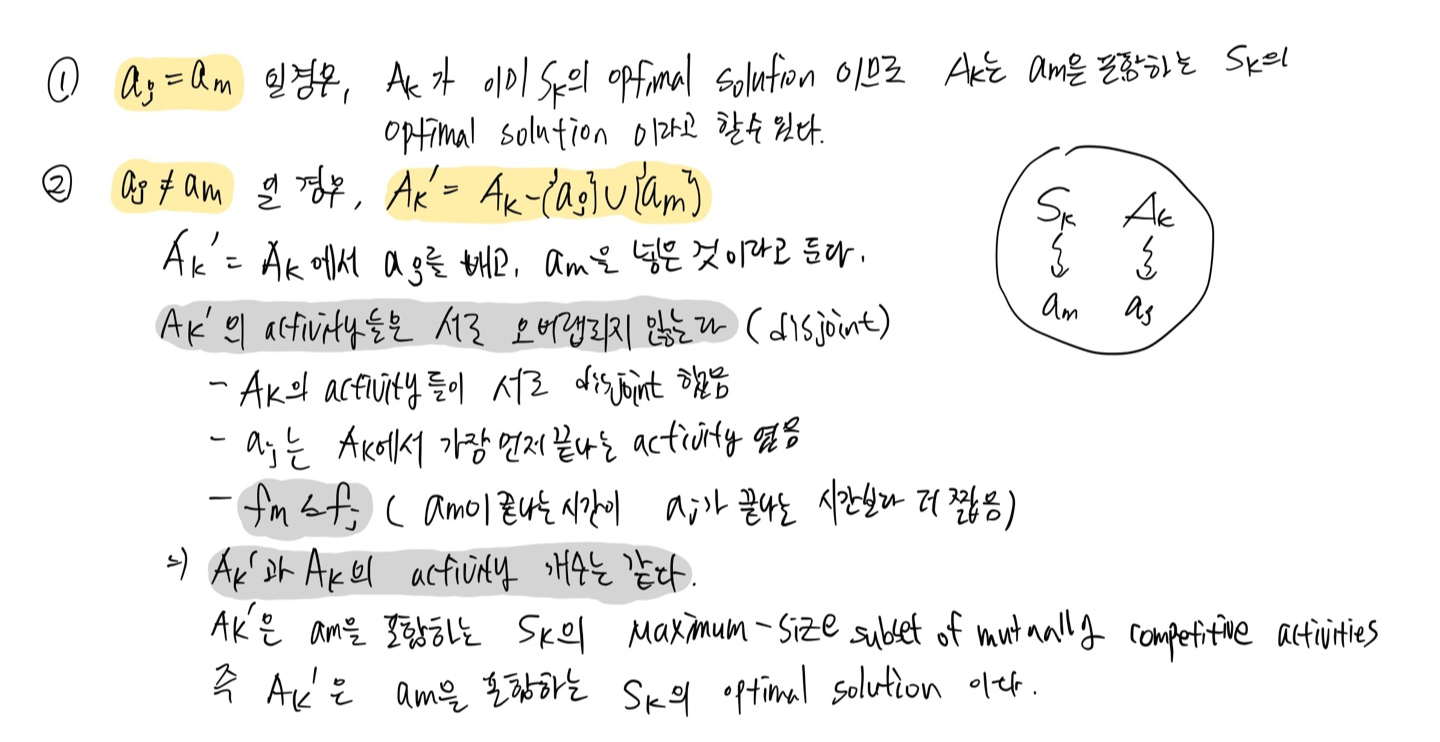 am은 Sk에서 가장 빨리 끝나는 activity이고, aj는 Ak에서 가장 빨리 끝나는 activity이다. 그렇기 때문에 am이 aj보다 빨리 끝날 것이다.(am이 더 빨리 끝나거나 aj랑 동시에 끝나거나) (Ak가 Sk의 optimal solution이라서 Sk가 Ak보다 더 포괄적이기 때문) 그래서 Ak'의 activity들은 서로 오버랩되지 않고, Ak'과 Ak에 속하는 activity들의 개수는 동일하다.