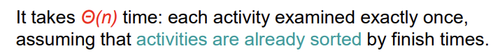 - finish time은 빨리끝나는 순서대로 정렬한다. (f1 ≤ f2 ≤ f3 ≤ ... ≤ fn)