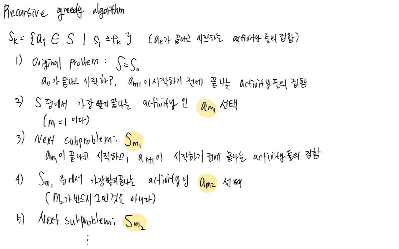 activity selection을 greedy algorithm으로 푸는 방법을 배웠당