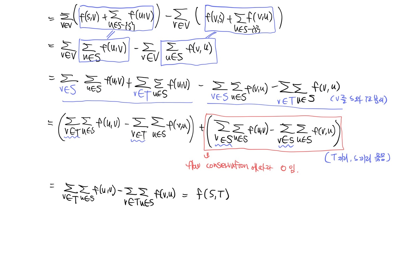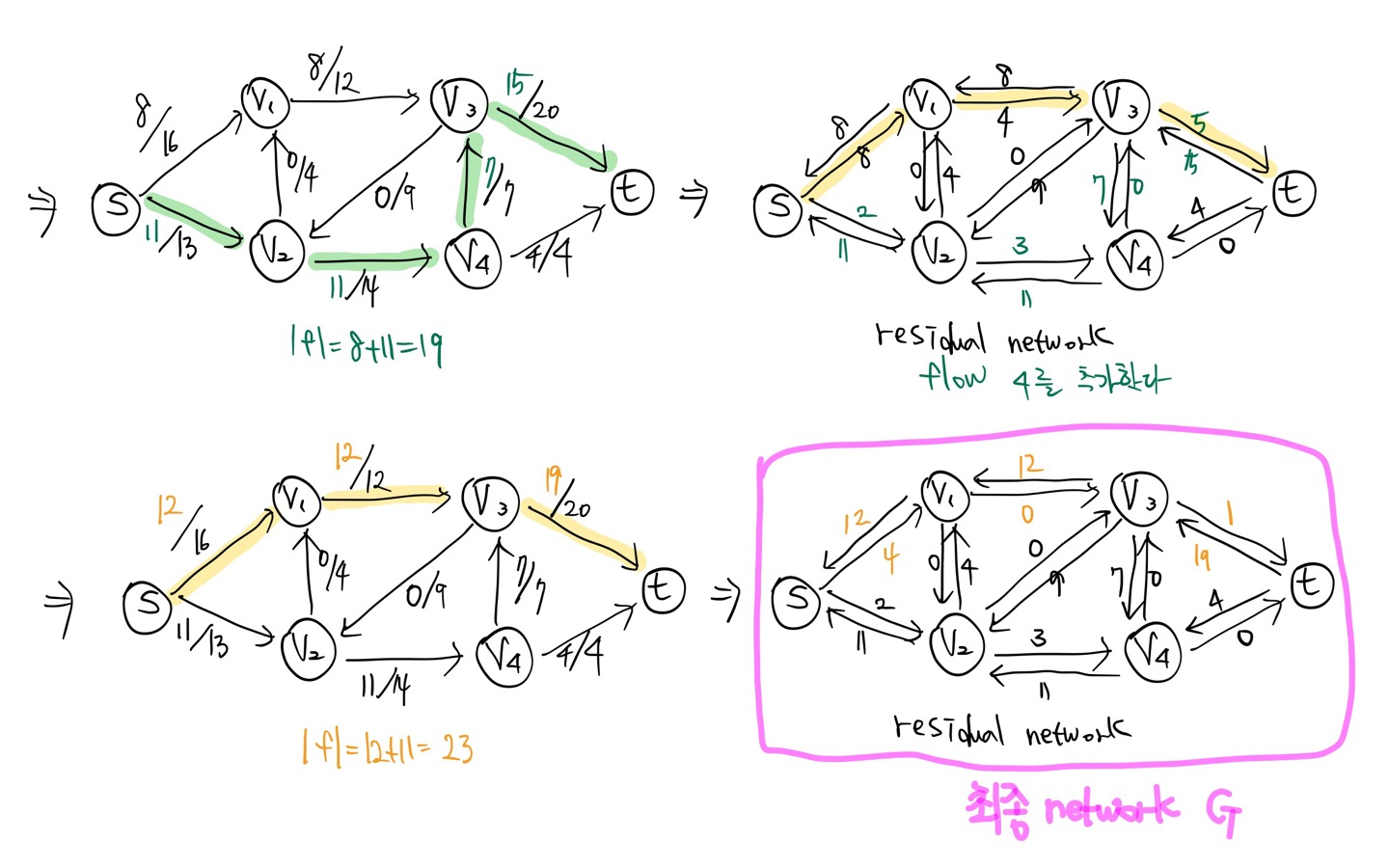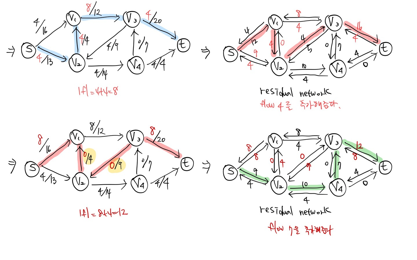 > residual network에 더이상 augemting path가 없을 때까지 flow 값을 증가시킨다.