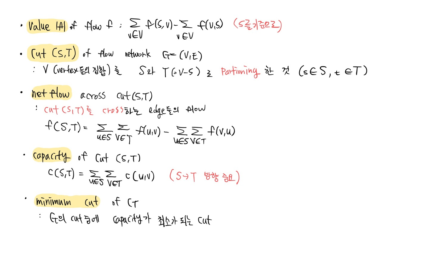 : flow network G가 주어지고, source s, target t, capacity c 가 주어질 때, value가 최대인 flow를 찾는 문제