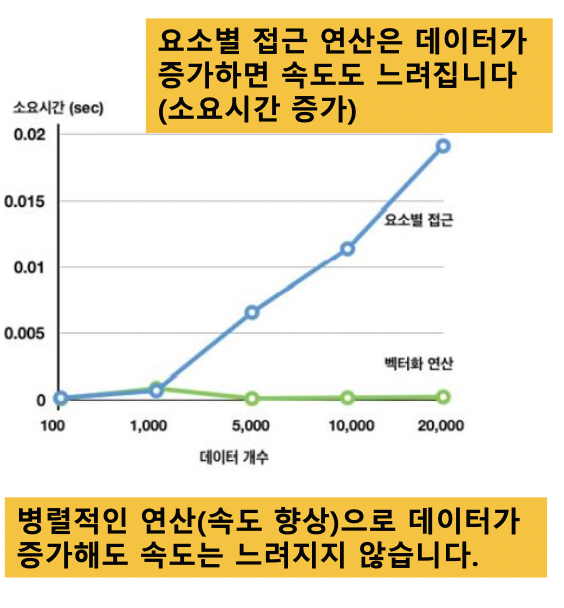 - 벡터화 연산은 배열의 원소 각각을 가져와 연산하는 것 X --> 하나의 명령이 여러 데이터에 동시에 적용됨