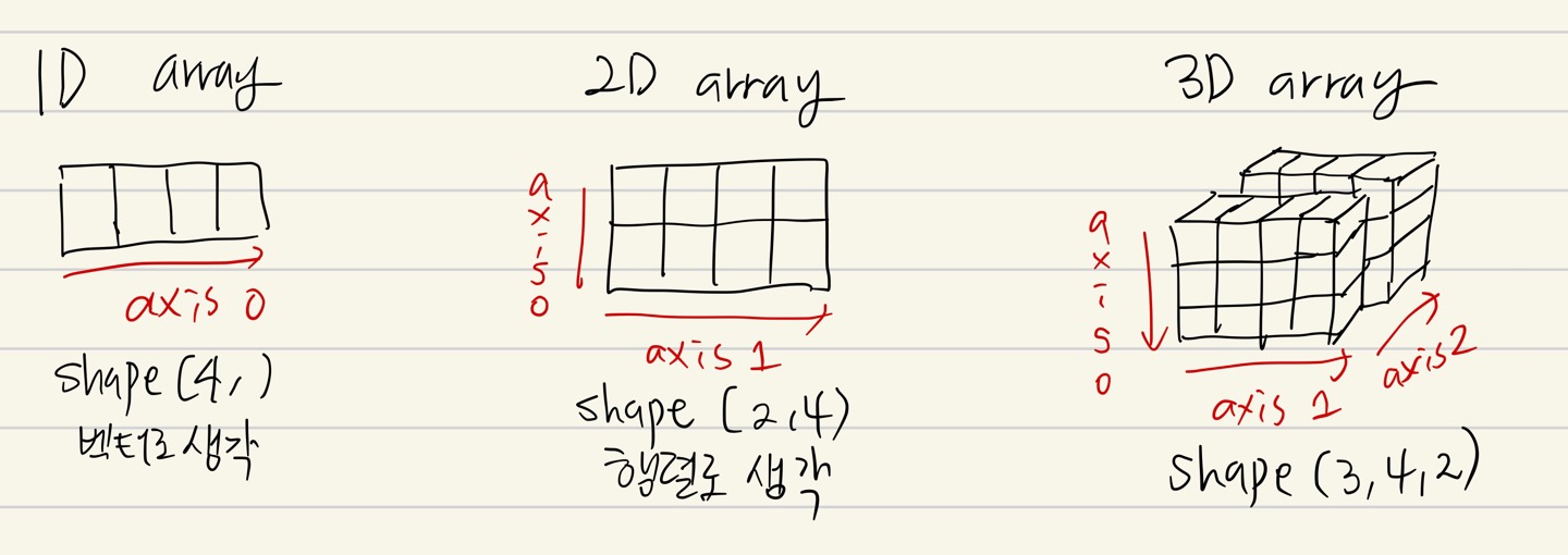 numpy의 배열은 1차원 - 벡터, 2차원 - 행렬 로 간주하여 연산