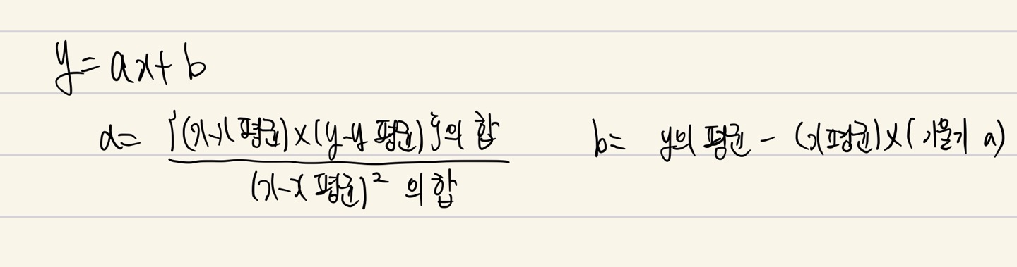- 최소 제곱법 공식을 알면, 일차 함수의 기울기와 y절편을 구할 수 있다.