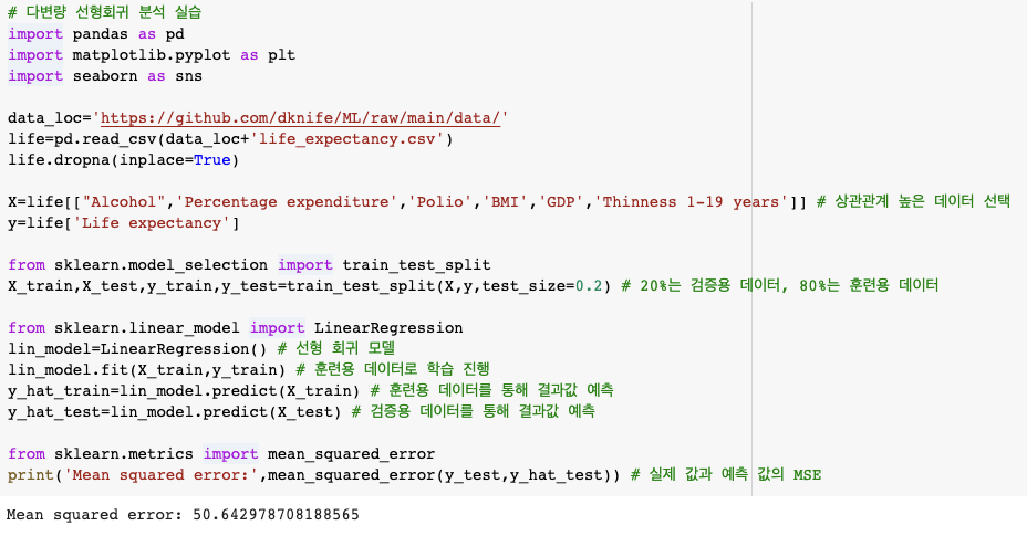 [다변량 선형회귀 분석 실습 - 훈련용 데이터와 검증용 데이터로 분리하여 학습]