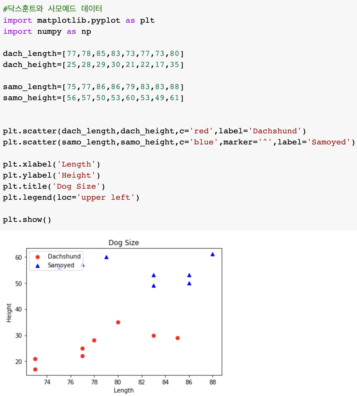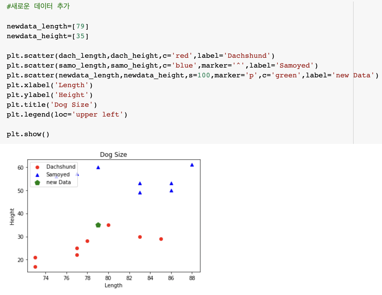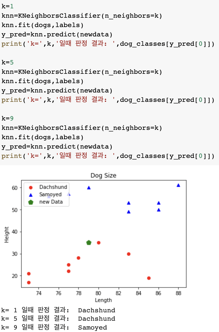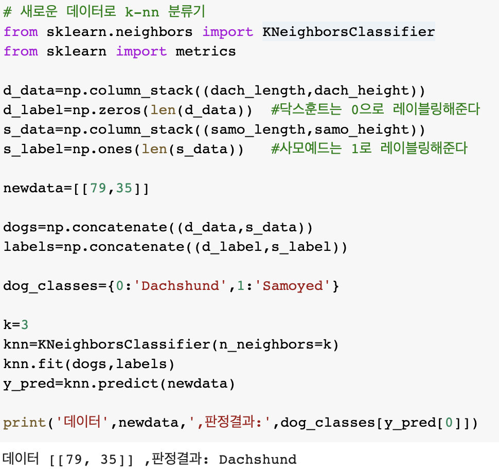 닥스훈트와 사모예드 데이터를 입력했고, 분류할 새로운 데이터까지 입력해주었다.
