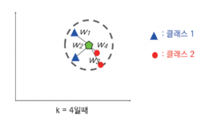 k-NN 알고리즘을 적용할 때, k의 값에 따라서 분류값이 달라진다.
