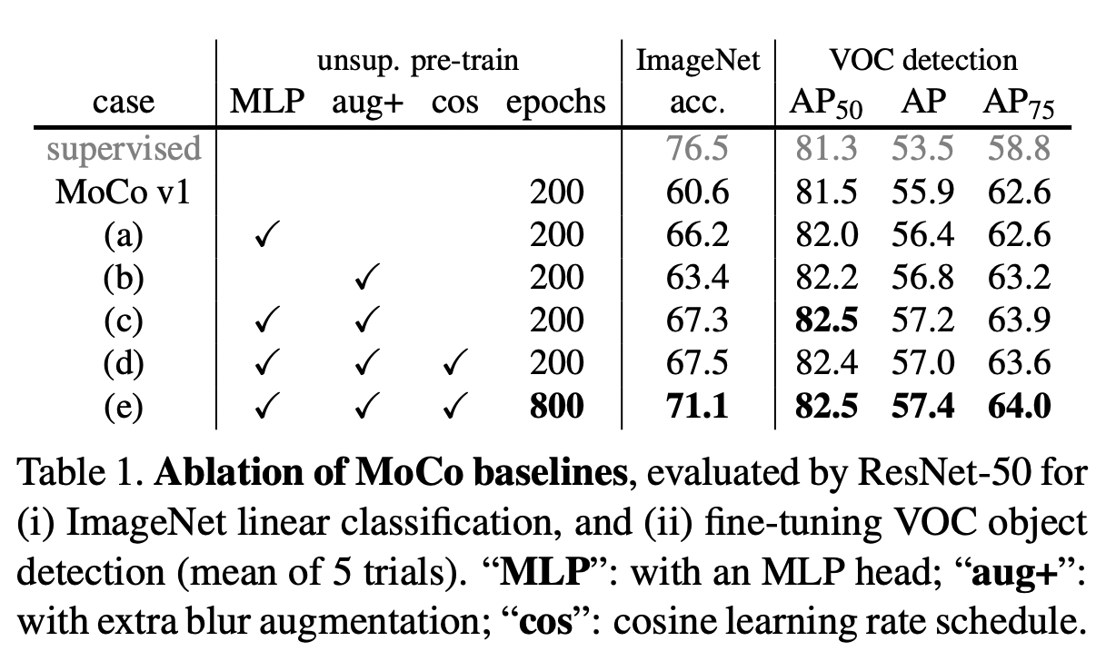 - MoCo에다가 SimCLR의 MLP projection head를 가져온 점