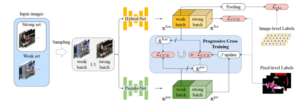 - weakly (image-level) labeled data에 대해서는 hybrid-Net's predictions(pseudo labels)과 비교하여 CCE loss에 의해 supervised 학습한다. => H2P training (hybrid-to-pseudo)