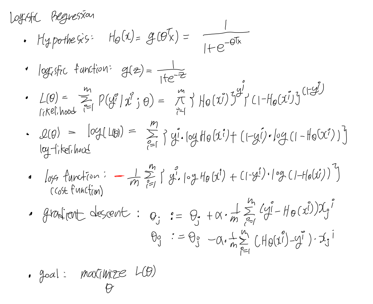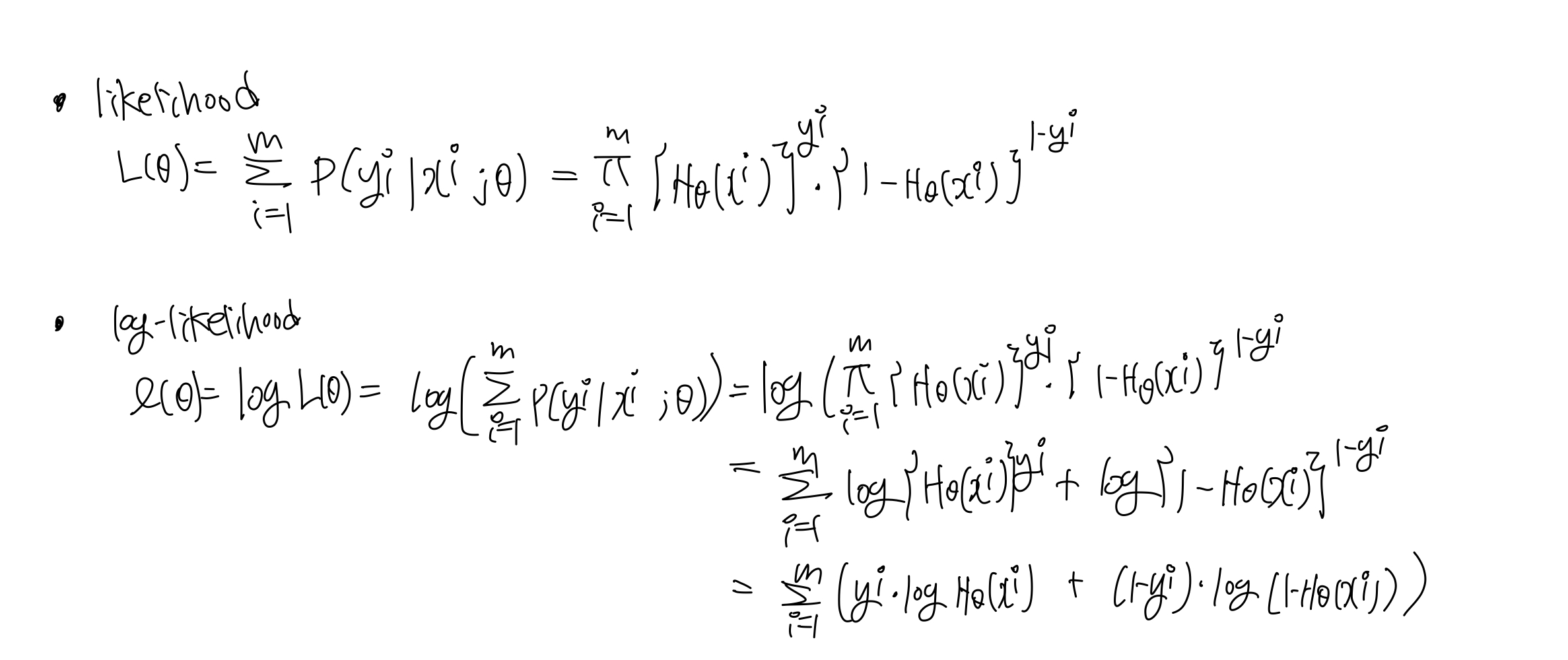 - logistic regression은 likelihood 를 최대화하는 parameter를 찾는 것이 최종 목표이다. likelihood를 계산하면 아래와 같다.