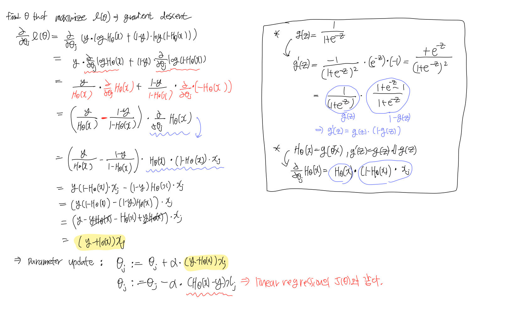 - log-likelihood를 최대화하는 값을 찾으면 되는데, 이때도 linear regression 때와 마찬가지로 gradient descent를 사용하여 계산한다. 계산과정은 아래와 같다.