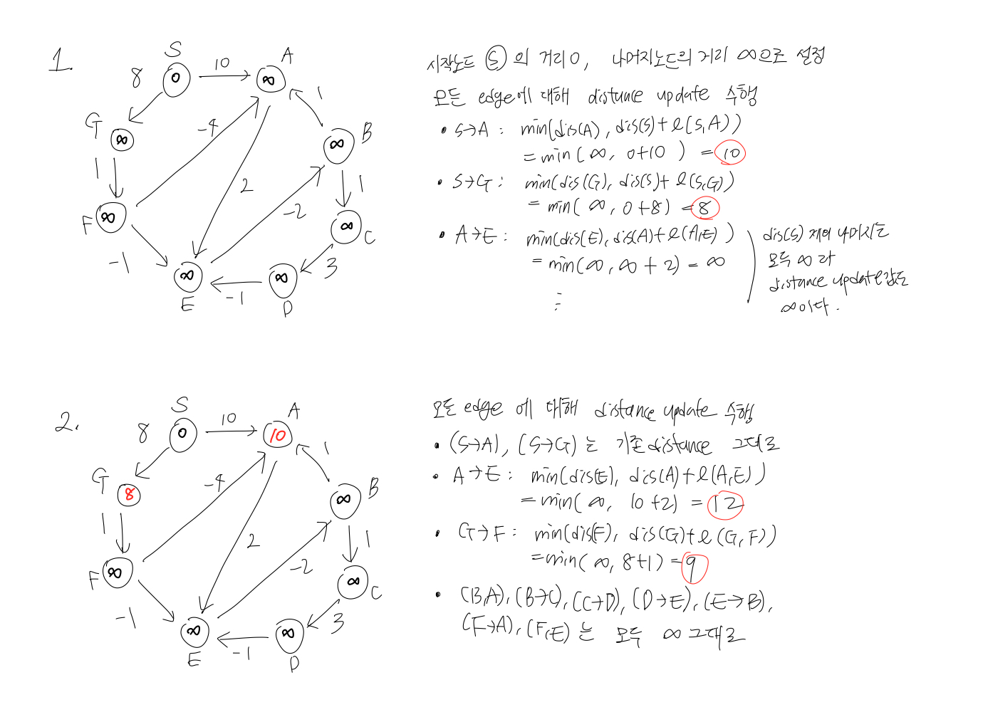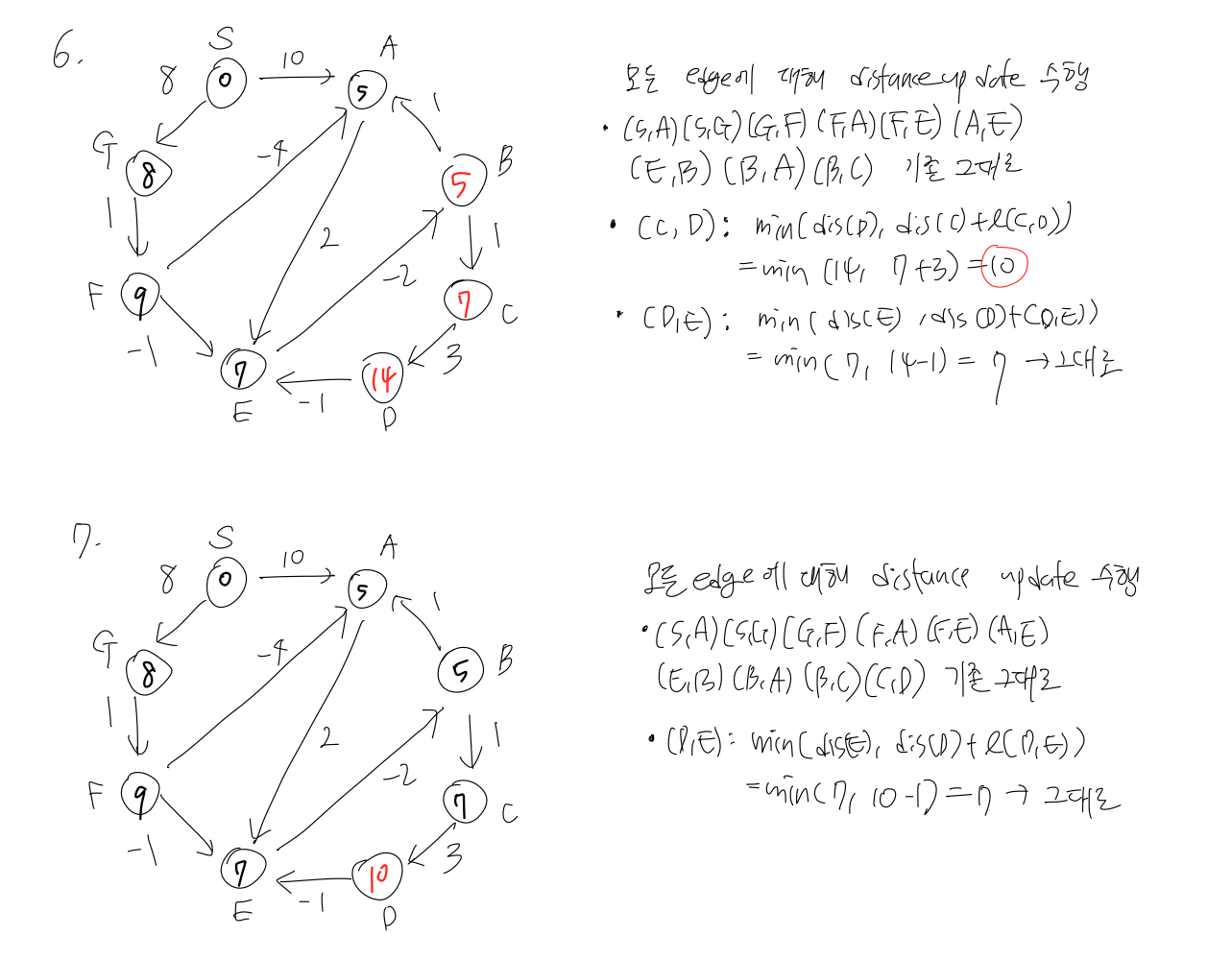 - 모든 edge에 대해서 distance update를 수행한다. -> 이를 |V|-1 회 수행한다.