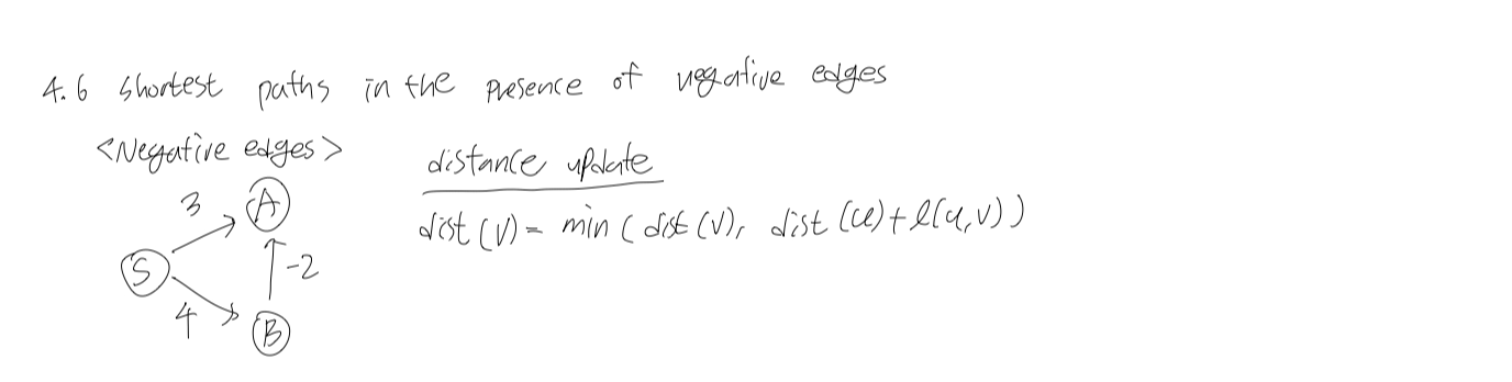 negative edges가 있는 graph에서 shortest path를 찾는 알고리즘으로는 Bellman-Ford algorithm 이 있다.
