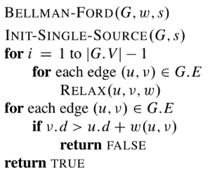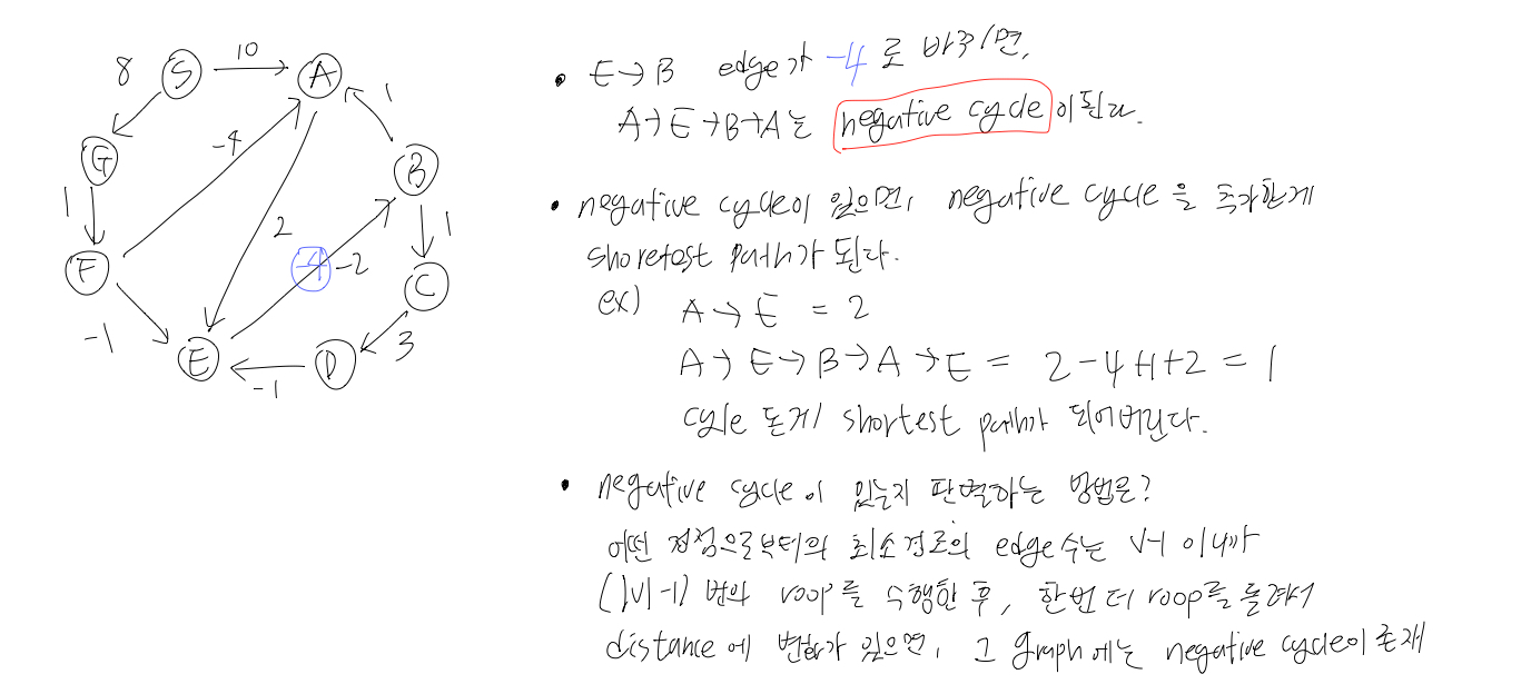- 이를 방지하고자 Bellman-Fold algorithm에서 |V|-1 번 동안 모든 edge에 대해 distance update를 시켜준 후, 한 번 더 모든 edge에 대해서 distance update를 시켜주는데 만약 이 마지막 distance update에서 update가 일어난다면, 이는 negative cycle이 포함되어있다는 뜻이 된다.