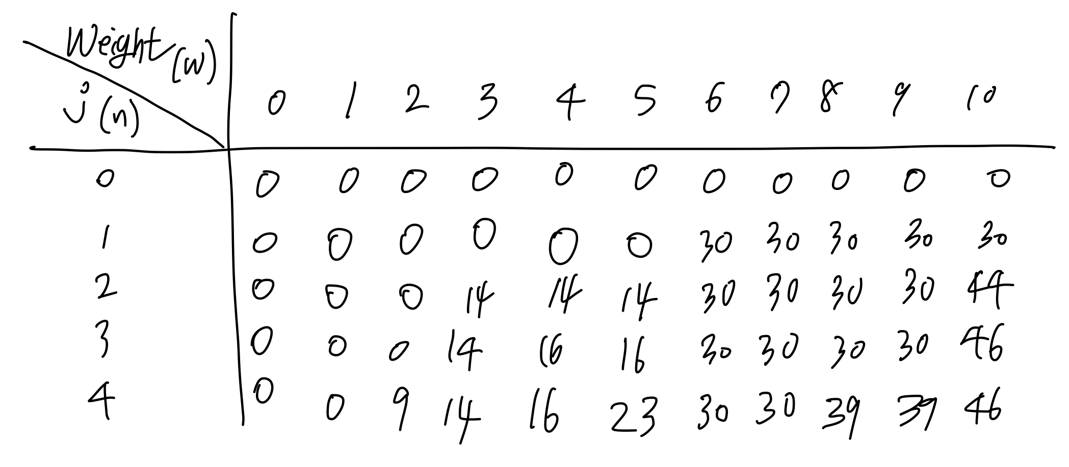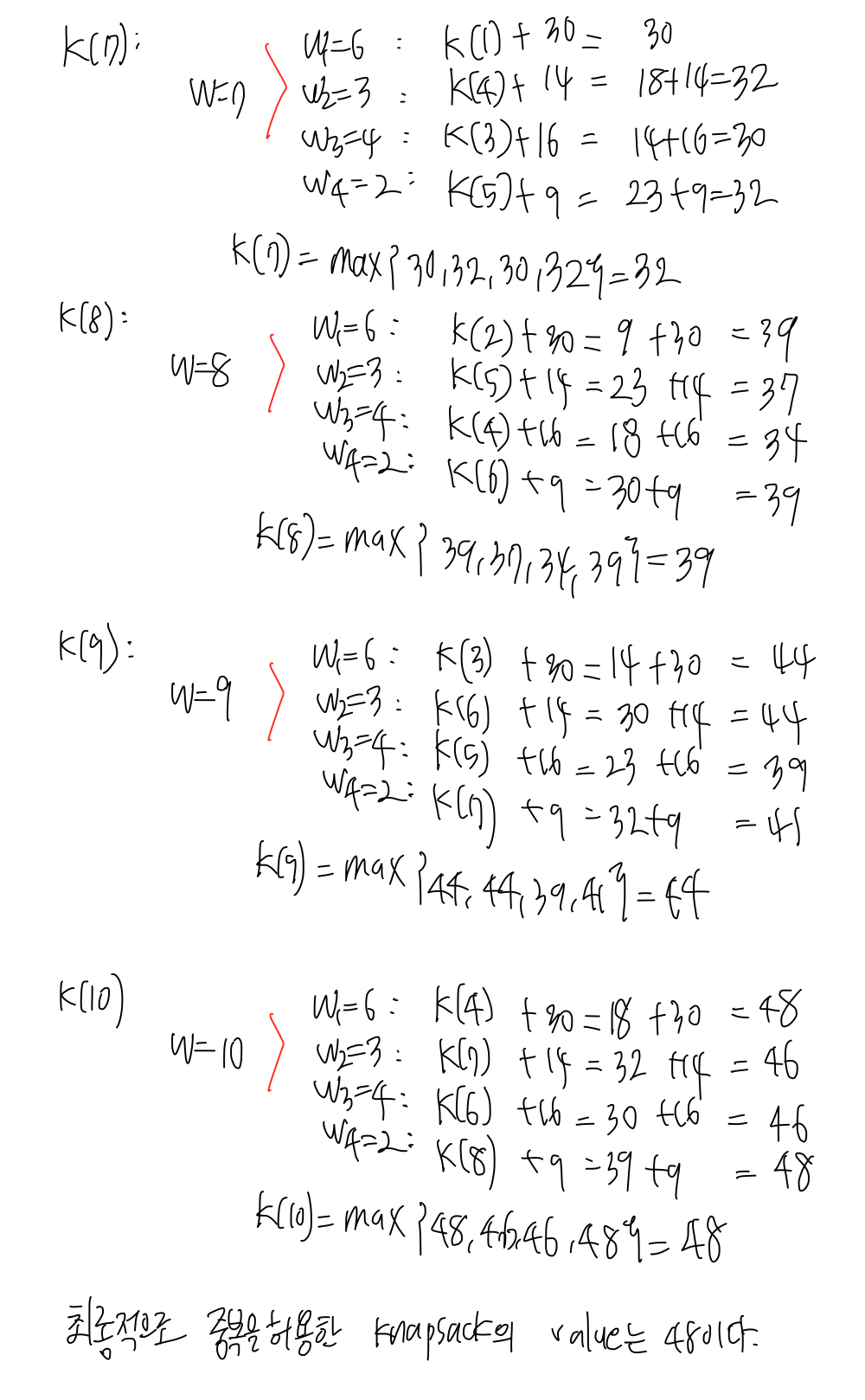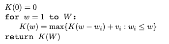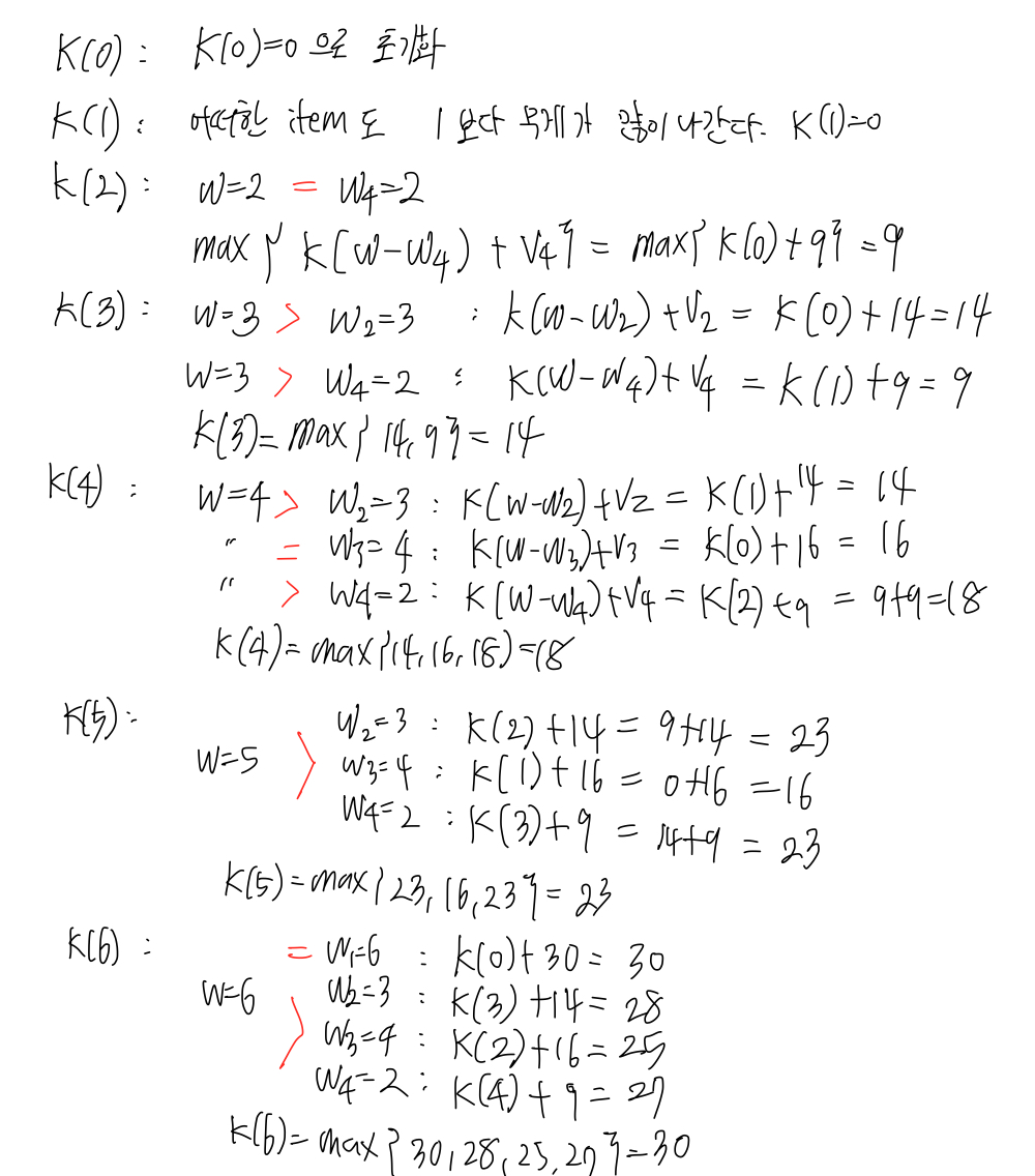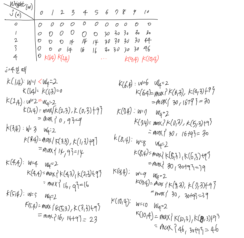 K(0) 은 0으로 초기화하고 K(w)에서 w를 1부터 W(10)까지 늘려나가며 knapsack의 최대 value를 계산해본다.