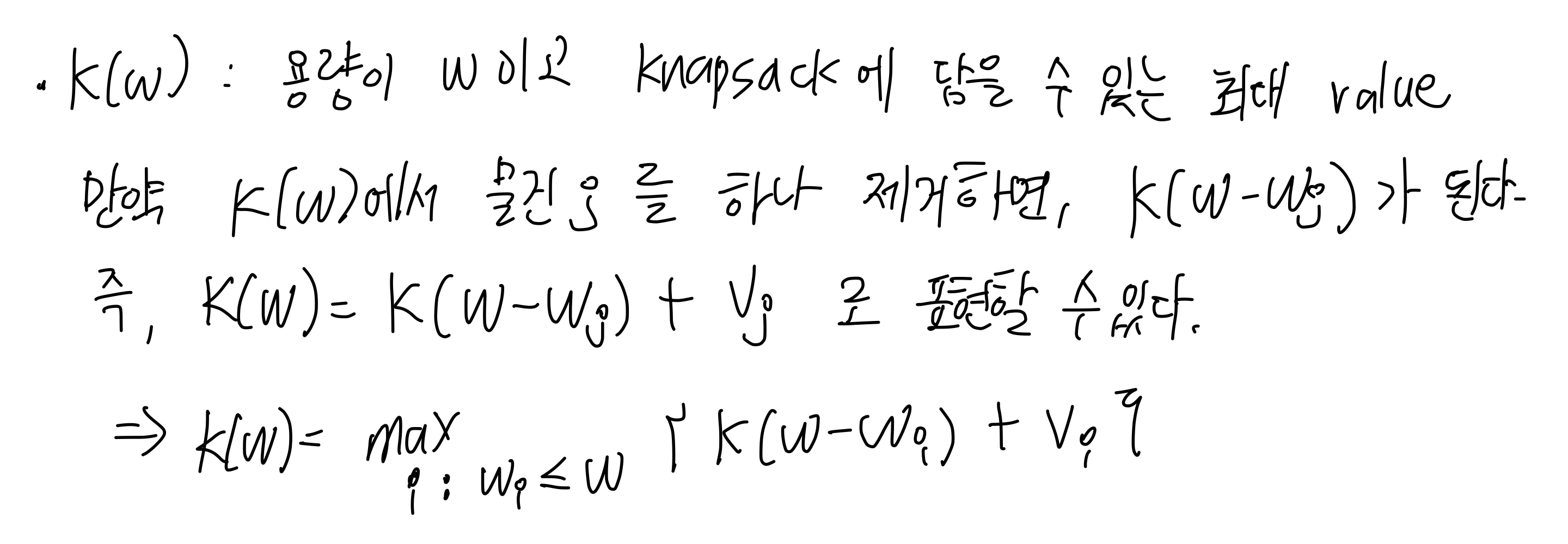 - knapsack은 중복을 허용하여 물건을 선택하는 경우와 중복을 허용하지 않고 물건을 선택하는 경우로 나누어 생각해 볼 수 있다.