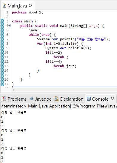 첫 번째 if 문 안의 break는 for문을 벗어나기 떄문에 다시 while문에 의해 for문으로 들어가서 i=0부터 시작하고, 다시 i가 2가 되면 for 문을 벗어나서 while문 처음으로 진입하게 된다. 그래서 이름 있는 반복문, 0, 1, 2 순서대로 반복된다.