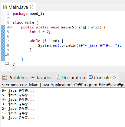 위의 while 문과 비교해보면, 7- java 공부중... 이 맨위에 출력된 것이 다름을 알 수 있다.