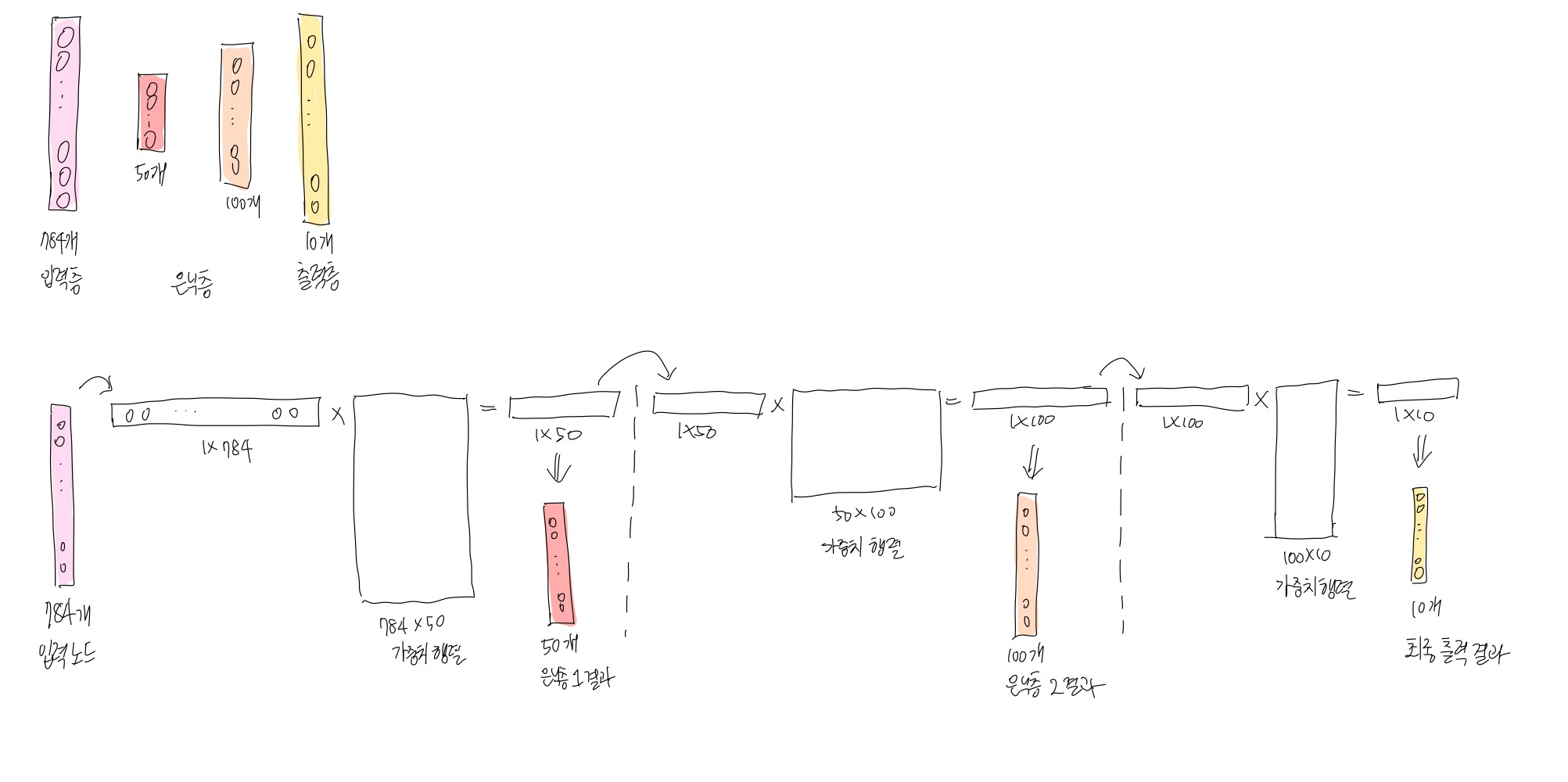 은닉층을 2개의 층으로 구성하고, 각각의 출력 뉴런개수를 50개, 100개로 둔다고 가정
