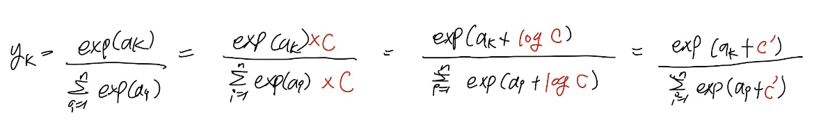 - softmax 는 식에 지수함수가 포함되어 있어서 오버플로에 주의해야한다.