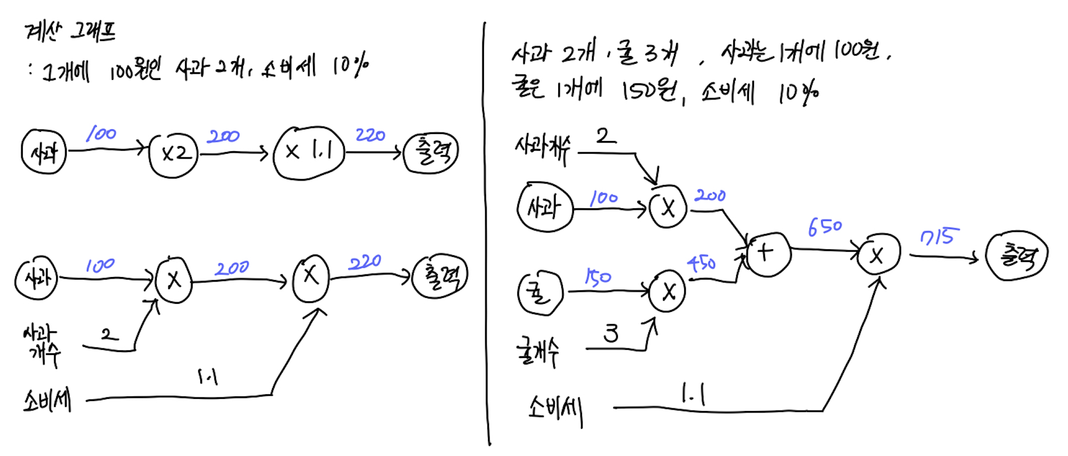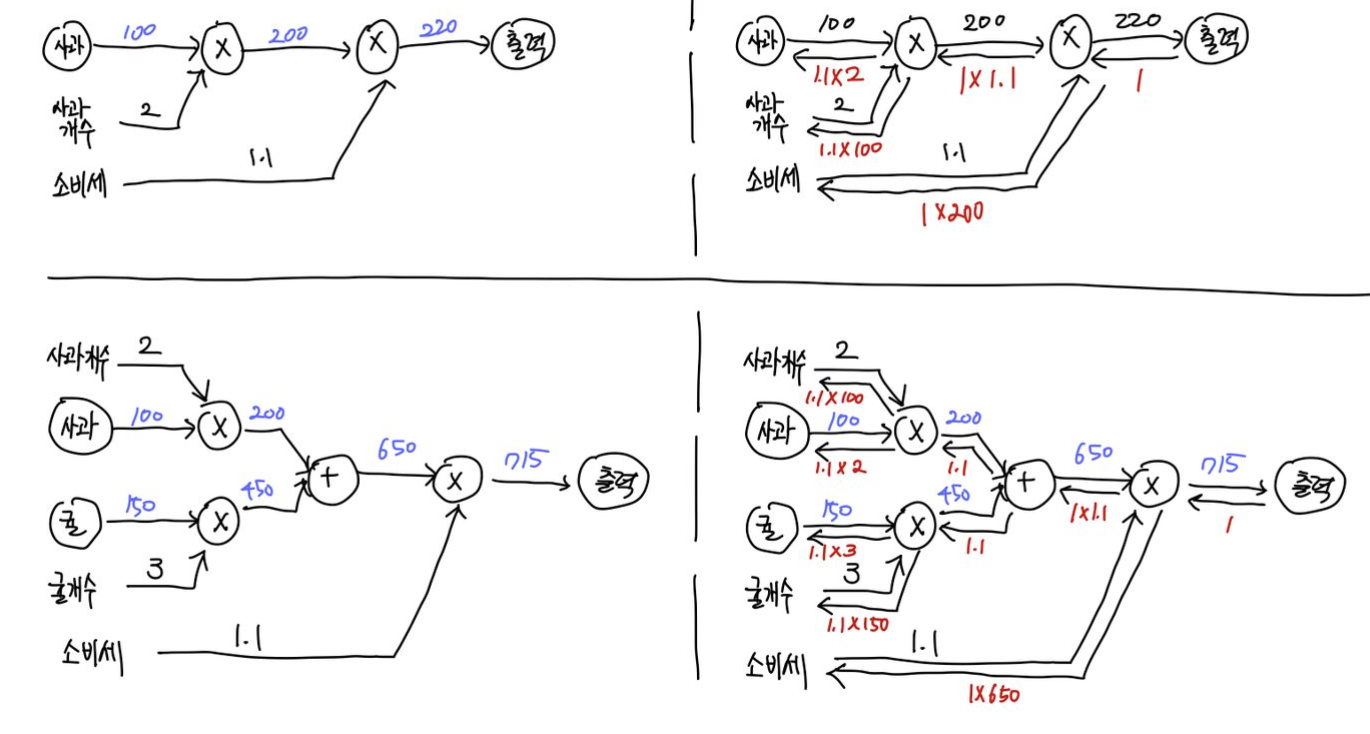 위와 같이 왼쪽에서 오른쪽으로 계산을 진행하는 것을 "순전파: forward propagation" 이라고 한다.