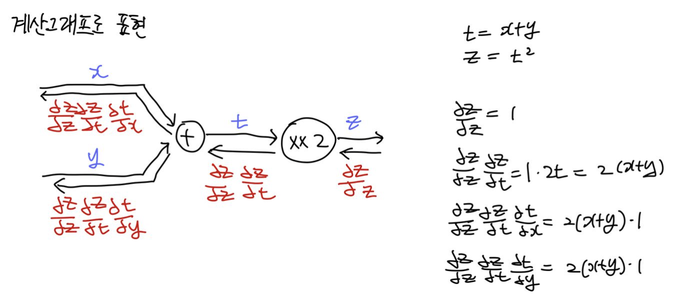 : 합성 함수의 미분은 합성함수를 구성하는 각 함수의 미분의 곱으로 나타낼 수 있다.