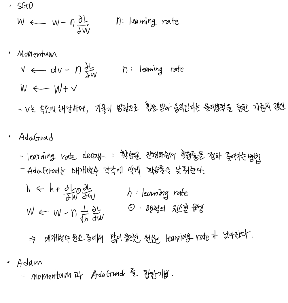 - dropout : 뉴런을 임의로 삭제하면서 학습하는 방법