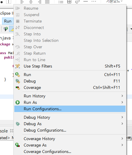 Run > Run configuration 을 눌러주면