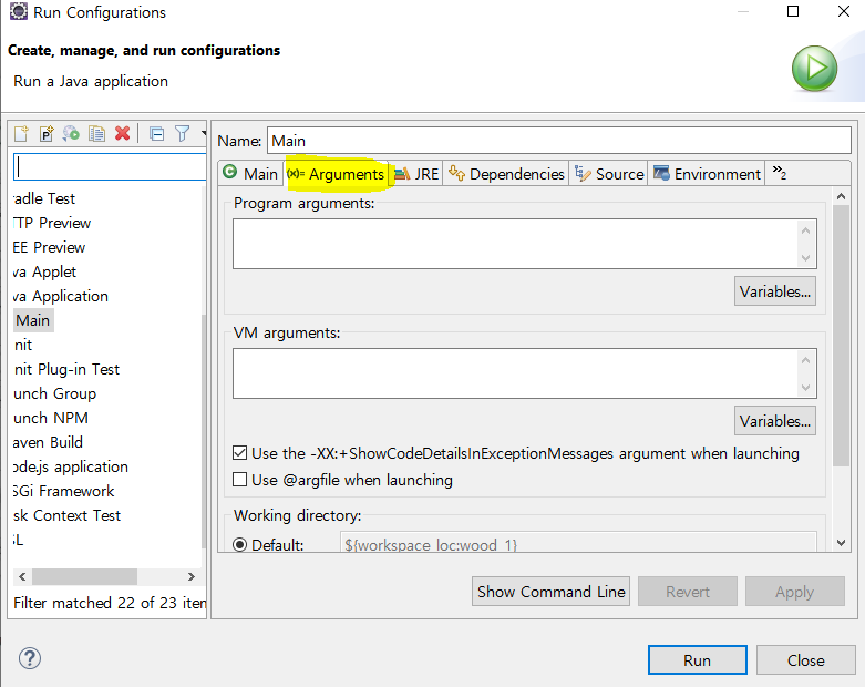 Run configurations 라는 창이 뜨는데 Arguments 를 눌러주고